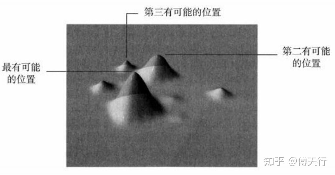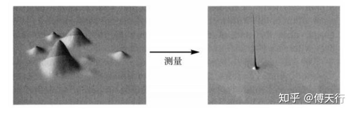 也可以用云雾来比喻单个电子的波函数,一个全空间性的波函数就像云雾一样填满了整个宇宙空间。在某一区域波函数的概率值越大,那么在该区域找到电子的概率也越大。与此相类似,波函数也可以跟大物体联系在一起。当我坐在椅子上时,我本质上是一个具有概率性质的波函数(排除意识)。如果我通过某种方法看见自己的波函数而不造成它的坍缩,那它肯定非常接近一团云。但是,云的整个部分会遍及整个空间,到达火星,超越太阳系,超越银河系。这意味着,我坐在椅子上而不是呆在火星上的可能性非常大。虽然我的部分波函数甚至已经散布出了银河系,但是我呆在另一个星系的可能性只是无穷小,然而却绝不是零4 。