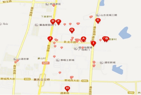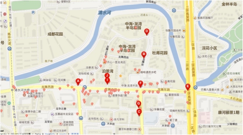 红色标记是带有“龙腾”的地名或者地标信息。此地的道路,超市,银行,行政机构等大都以“龙腾”命名。总共95个龙腾命名的地标信息。贯穿其中的河,叫做“清水河”,它在图中的形状很像中华民族的母亲河:黄河。