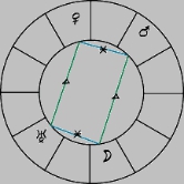 大四角格局(Mystic Rectangle)是由四颗星所组成。其中总共形成两个对冲,两个三合与两个六合。大四角格局的命格因为是刑冲调和相位都同时存在,所以一生中都是挑战味道十足,是顺境中带有压力,逆境中带有协助与激励。因为顺境中有压力,所以不会骄傲或掉以轻心;因为逆境中有其他相位协助,所以只要肯吃苦大半都能成功,不至於灰心丧志。这种人您或许会羡慕他们的成就,可是当您了解他们的奋斗过程後,往往会更感动佩服其毅力坚强,气度宏伟。